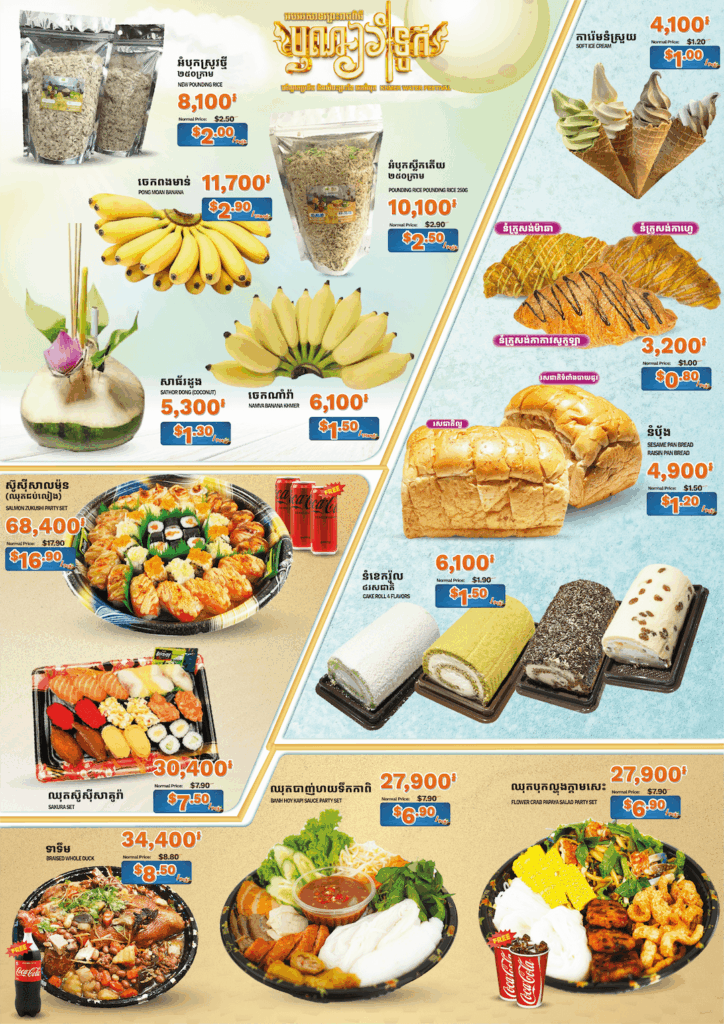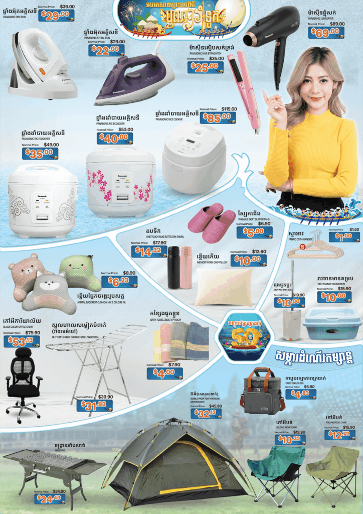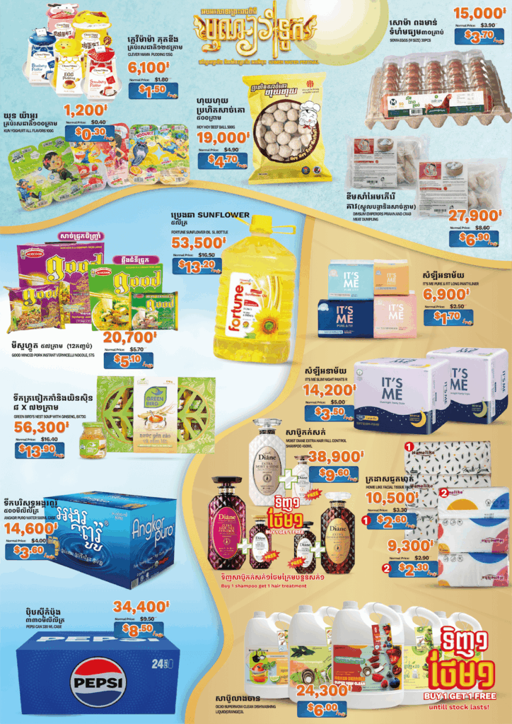 ញ្ចុះតម្លៃ រហូតដល់៥០%លើទំនិញជាច្រើនមុខ ដូចជា៖ អាហារ គ្រឿងទេស សម្ភារៈប្រើប្រាស់ គ្រឿងអេទ្បិចត្រូនិច សម្លៀកបំពាក់បុរសនារី កុមារ និងទំនិញជាច្រើនទៀត!