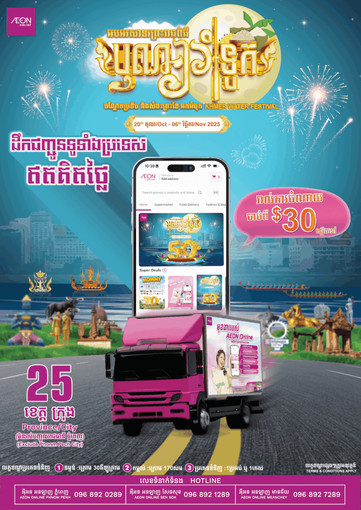 - សម្រាប់ការបញ្ជាទិញនិងដឹកជញ្ជូនទៅបណ្ដាខេត្តចាប់ពី ៣០ដុល្លារ តាមរយៈអ៉ីអន អនឡាញ (មិនរាប់បញ្ចូលក្រុងភ្នំពេញ)។